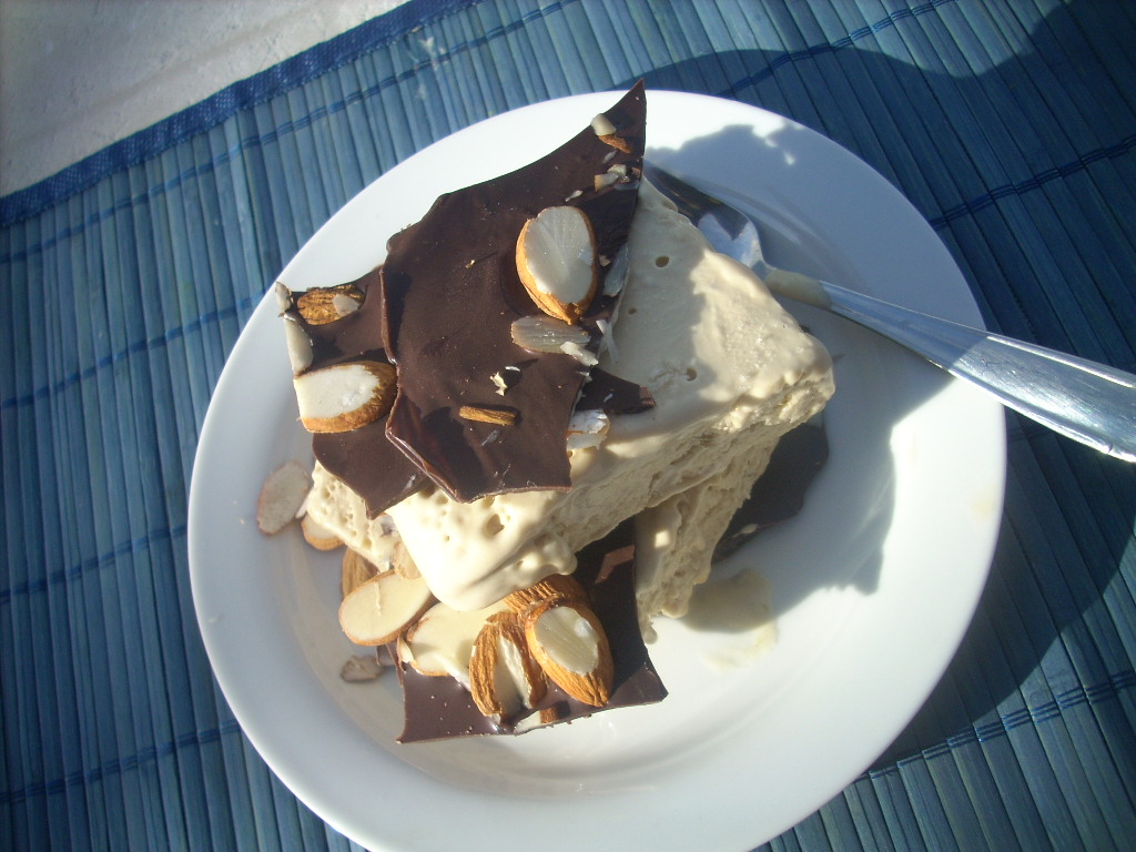 Cut into 3 strips lengthwise and then cut into 4 rectangles. Freeze ice cream rectangles if it has not been prepared chocolate and almonds pieces)