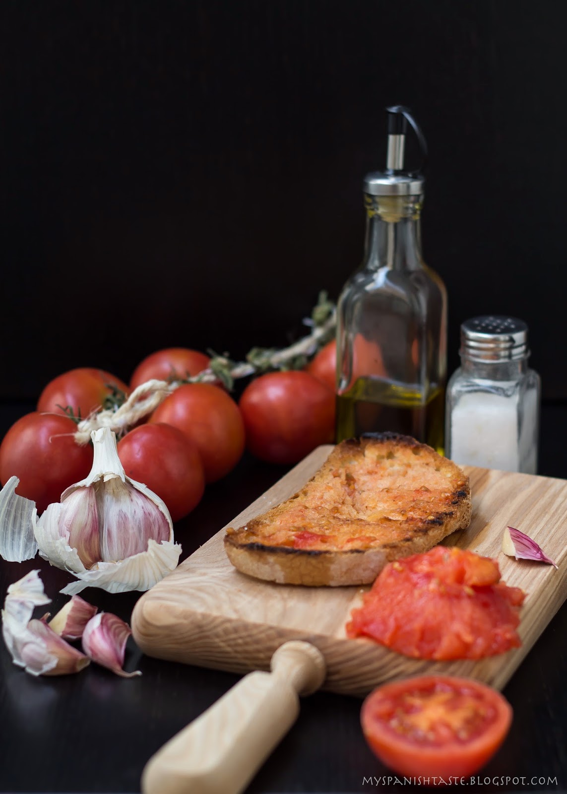 I overheard once such a comment: ''In most places in which pan con tomate is served, they have no clue how to prepare it''. It caused that every time I ate this bread in a tapas bar or a restaurant I was wondering whether or not this one is the properly prepared:). So, I started to look for information on the true Catalan pa amb tomàquet. Since then, I know one thing for sure: this is not a slice of bread smeared with grated tomato mixed with olive oil and salt!. The authentic pan con tomate is prepared by rubbing a slice of bread with ripe tomato, cut in half - ideally if it's tomato called tomate de colgar/tomàquet de penjar. In old times, these particular tomatoes came from the summer harvest and were subsequently eaten during the rest of the year. Normally, the tomatoes were attached to a string and hung in places such as attic, where very slowly were becoming ripe. A characteristic of these tomatoes is that the pulp is very soft, juicy and easily moves away from the skin, therefore, after the tomato is rubbed into bread what remains is only its skin. Pan con tomate is prepared from fresh bread, or slices of bread toasted in the oven, toaster, or on a grill, and it is mostly bread called pan rústico / pa de pagès. Often, but not always, the first step is to rub the bread with garlic clove cut in half. Then the tomato is rubbed into it and finally the bread is drizzled with olive oil and sprinkled with salt. Pa smb tomàquet can be eaten just plain, without any additives, or with serrano ham, chorizo sausage, or with a variety of cheeses. The key to the perfect taste of pan con tomate are undoubtedly good quality ingredients: crispy bread, very ripe and juicy tomatoes and good quality olive oil.